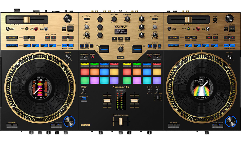 The DDJ-REV7-N is built to help you get the most from the Serato DJ Pro and rekordbox performance software and boasts a brand-new design that includes large, motorized jog wheels with On Jog Display to create a tactile connection between you and your music. The layout of this 2-channel unit emulates a professional DJM-S mixer + PLX turntable setup, and includes specialized features for open-format and scratch DJs.