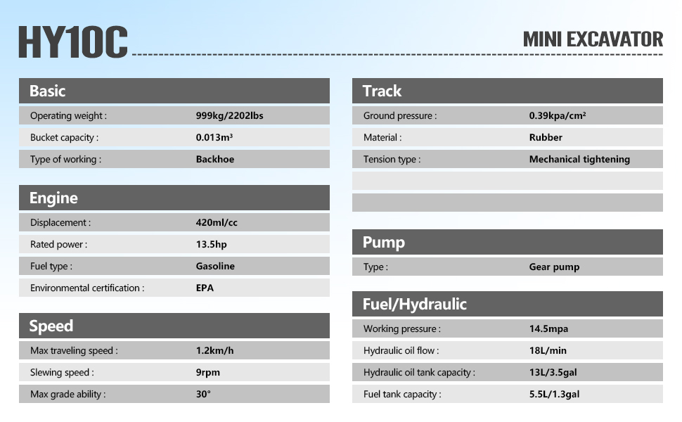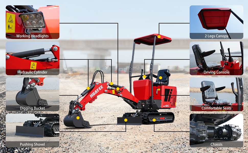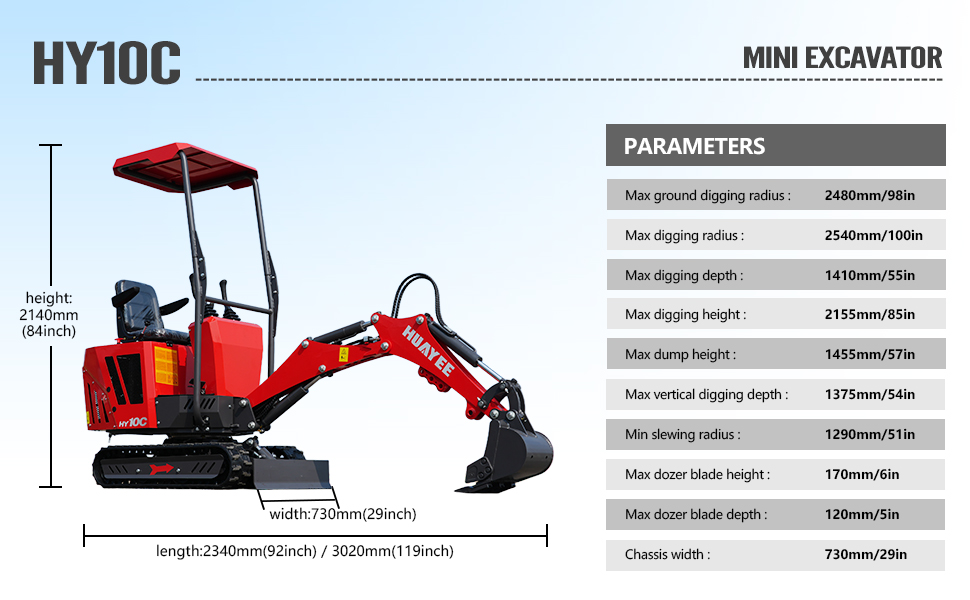 - With a compact body and a total weight of only 1 ton, the HY10C mini excavator excels in confined spaces where larger machinery cannot reach. Easily transport it with a trailer and navigate through standard gates to operate effortlessly in backyards, gardens, and farms.