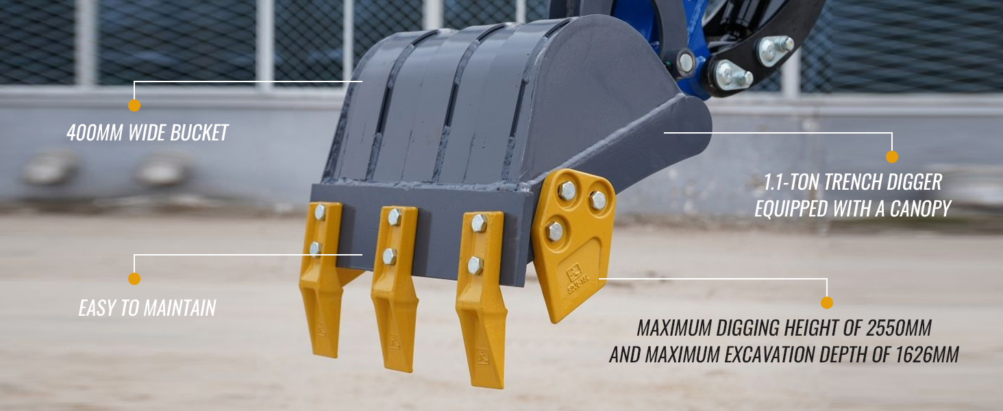 - 4. User-Friendly Design Micro digger is extremely easy to maneuver, even for first-time users. Comes with a boom swing for extra agility. Possesses a maximum digging height of 2550mm and maximum excavation depth of 1626mm. 400mm bucket with a capacity of 0.025cbm and platform ground clearance of 132mm allow easy operation for all excavation, drilling, or bull-dozing jobs.