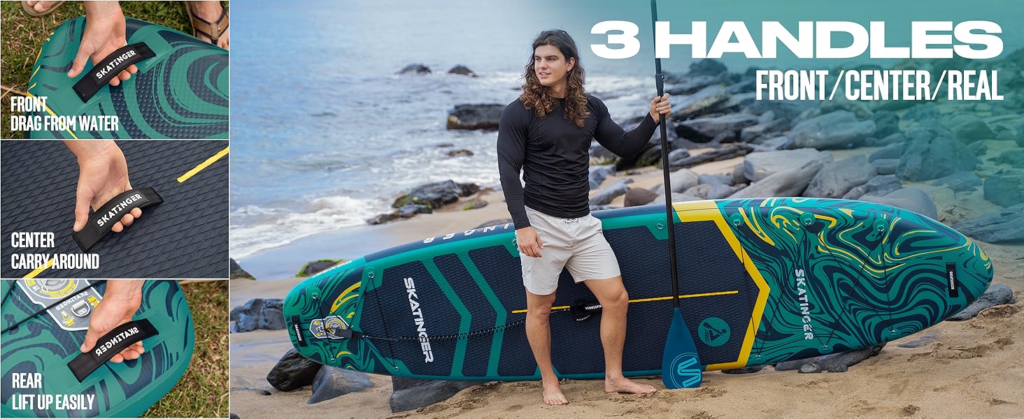 - 【EASY TO TRANSPORT WITH 3 HANDLES & 1680D BACKPACK】Skatinger paddle board features a heavy-duty 1680D fabric backpack (more durable than standard 900D materials) for easy transport. The three handles—front, rear, and middle—provide convenient lifting and maneuvering, whether you're loading it into your vehicle, moving it around, or handling it solo or with a partner.