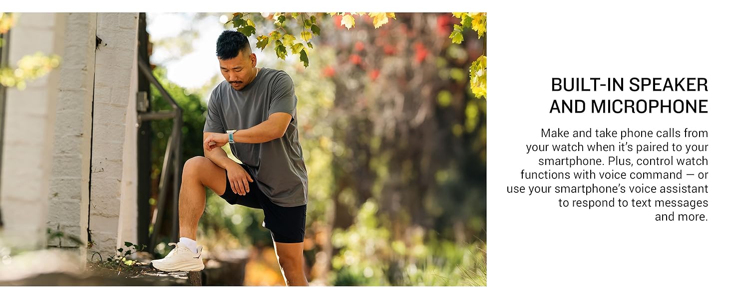 - Built-in microphone and speaker let you make and take phone calls from your wrist when your watch is paired to your smartphone — and you can even use your smartphone’s voice assistant to respond to text messages and more