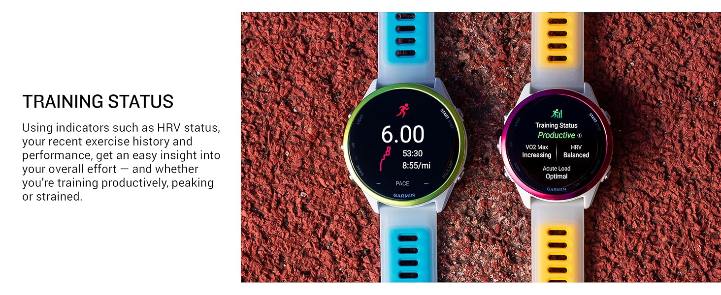 - Using indicators such as HRV status, recent exercise history and VO2 max, get insight into training effectiveness with training status — and know whether you’re training productively, peaking or strained (data presented is intended to be a close estimation of metrics tracked)