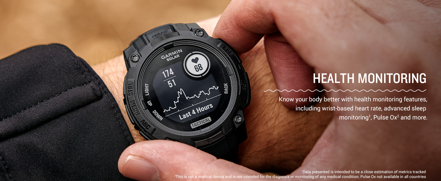 - Know your body better with health monitoring features, including wrist-based heart rate, advanced sleep monitoring, Pulse Ox and more (this is not a medical device, and data presented is intended to be a close estimation of metrics tracked; Pulse Ox not available in all countries)