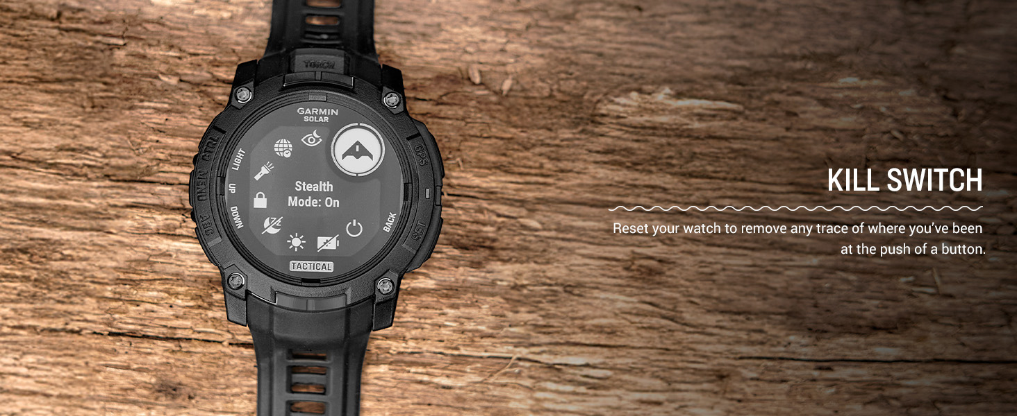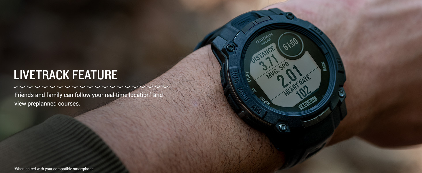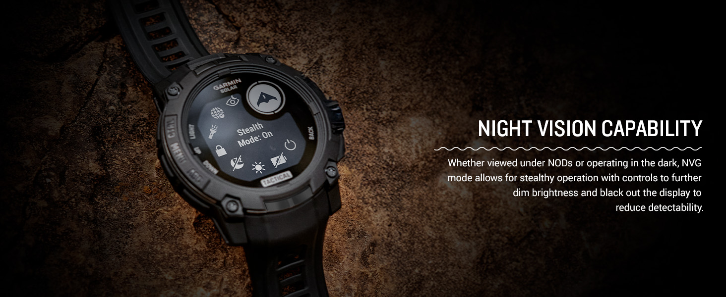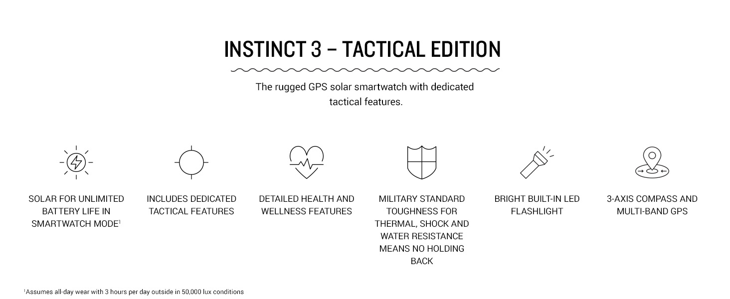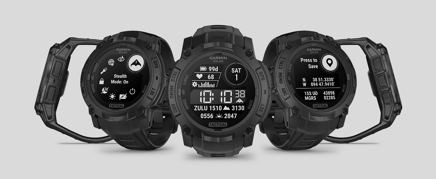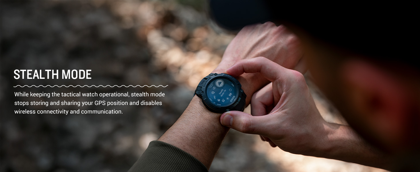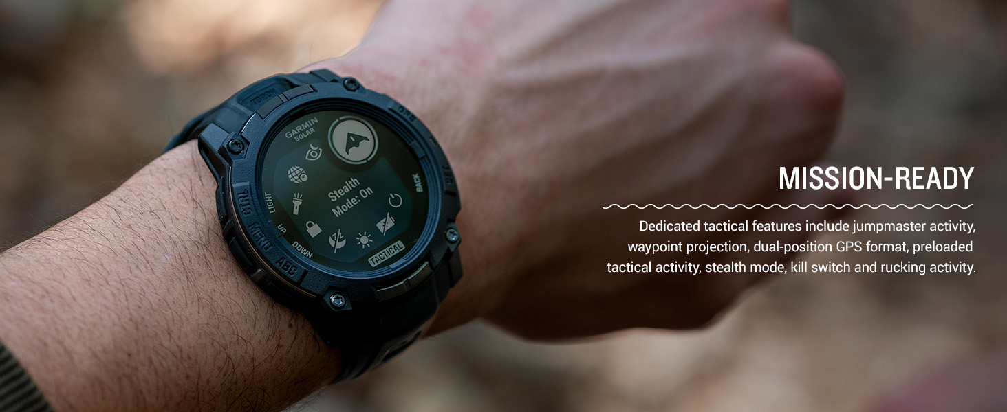 - Dedicated tactical features include jumpmaster activity, waypoint projection, dual-position GPS format, preloaded tactical activity, stealth mode, kill switch, compatibility with night vision goggles and a rucking activity