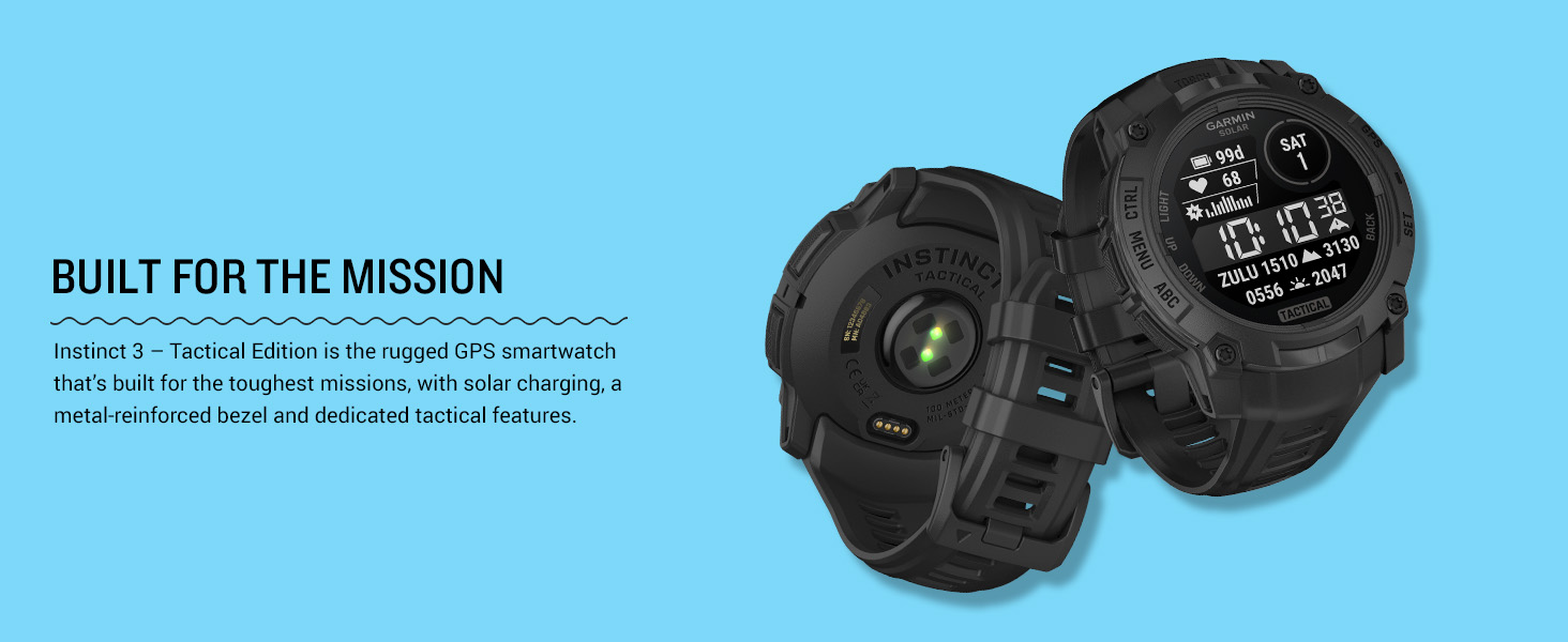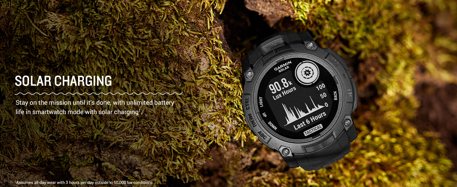 - Lead the mission with this rugged GPS smartwatch, featuring solar charging for unlimited battery life in smartwatch mode (assumes all-day wear with 3 hours per day outside in 50,000 lux conditions)