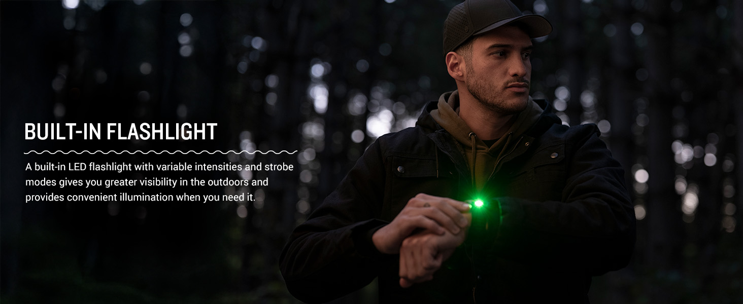- Built-in LED flashlight with variable intensities and strobe modes gives you greater visibility in the outdoors and provides convenient illumination when you need it